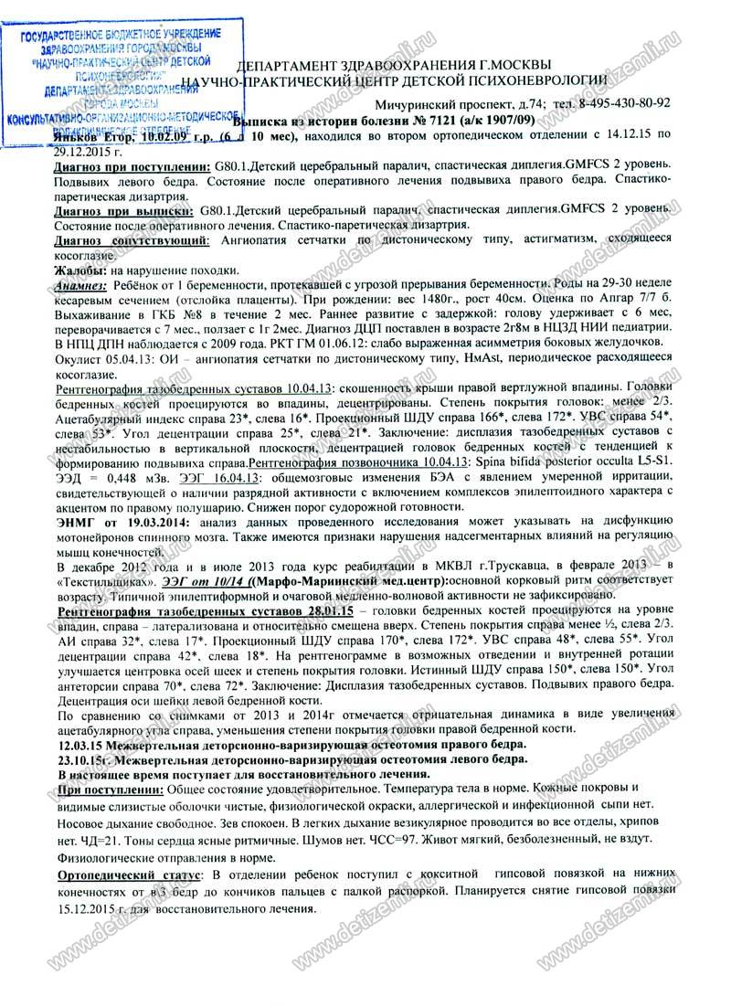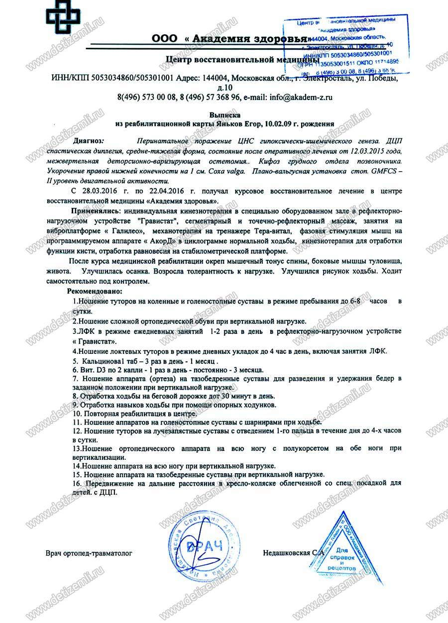 Из письма мамы Егора: Я с момента постановки диагноза стала усердно заниматься с Егором физическим и психическим развитием. Первые самостоятельные шаги Егор начал делать в 4 года. Но до сих пор он самостоятельно может сделать только несколько неуверенных шагов. В психическом плане Егор развивается по возрастной норме. Он уже читает, считает, пишет. Когда он сидит, никто даже не догадывается, глядя на него, что он тяжело болен, но вот когда Егор встает и пытается идти, у некоторых на глазах появляются слезы. В наших с Вами силах помочь больному ребенку! Сейчас Егору необходимо лечение в клинике стоимостью 134 000 рублей.