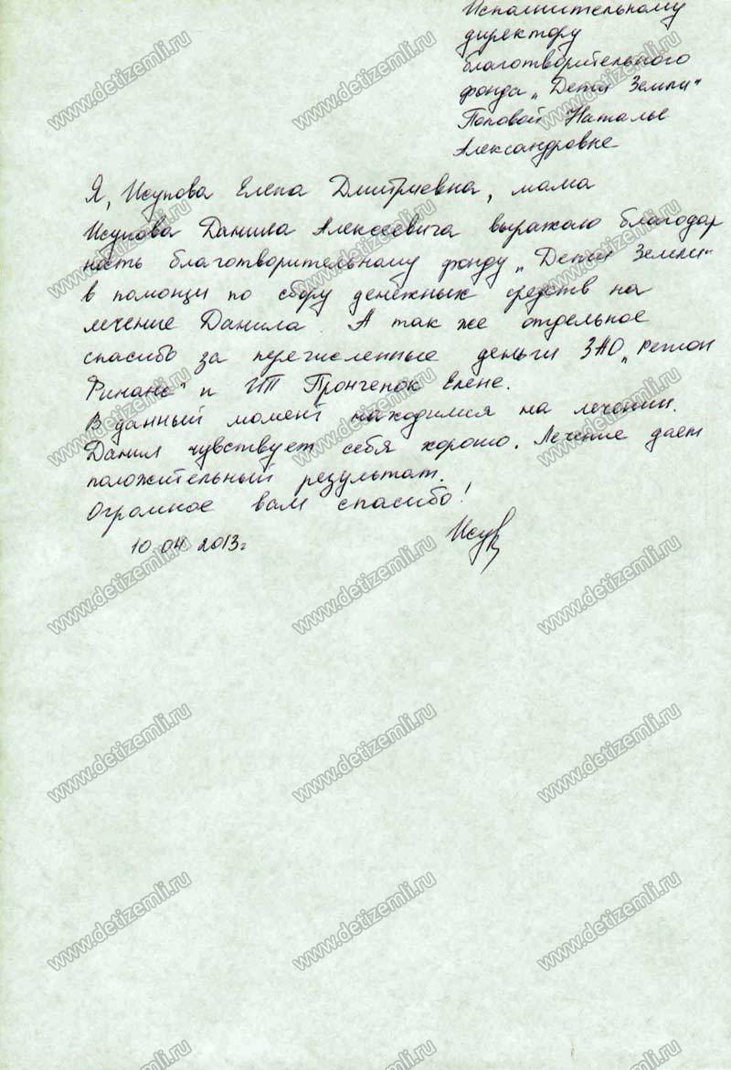 Московский благотворительный фонд помощи детям «Дети Земли» заканчивает сбор пожертвований на курс лечения Данилы. Лечение уже оплачено. Спасибо всем огромное! Вы отдаете частичку тепла больным детям, даете им шанс на выздоровление.
