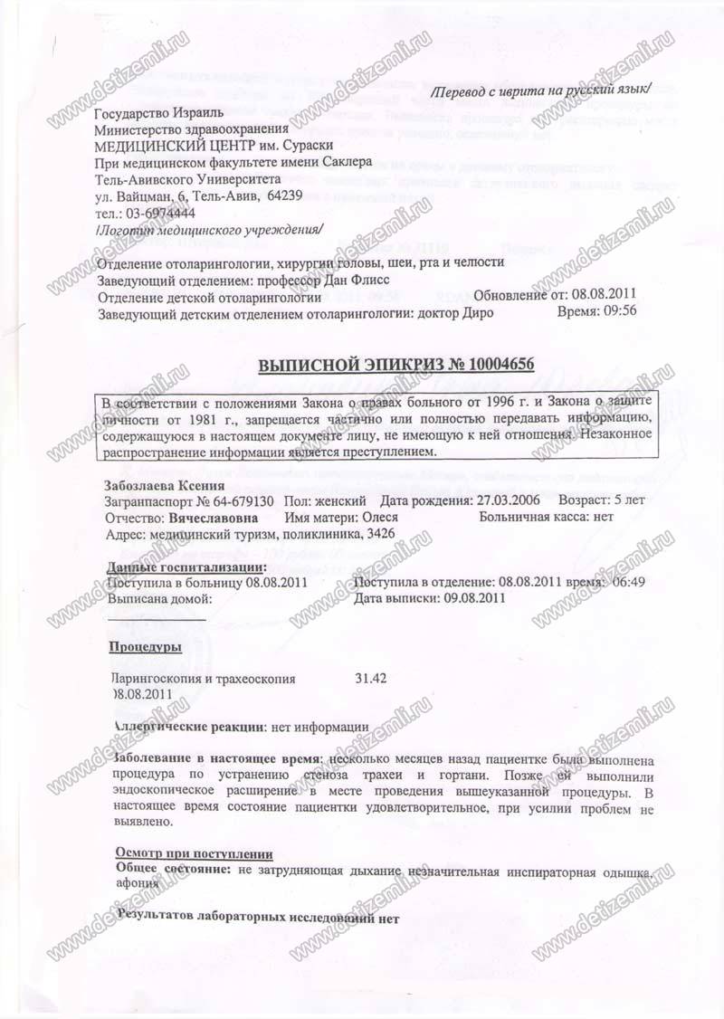 Ксения родилась совершенно здоровым ребенком. До четырех лет она росла жизнерадостной девочкой. В июле 2010 года врачи обнаружили у нее небольшую кисту на шее, которую, как они сказали, надо обязательно удалить. Во время операции врачи случайно повредили трахею. Ребенка положили в реанимацию. Месяц девочка находилась между жизнью и смертью. В феврале 2011 года Ксюша была прооперирована. Операция была очень тяжелая и уникальна по своей методике. Была сделана пластика трахеи. Сейчас Ксении срочно необходима повторная операция в Израиле стоимостью 5057 евро. Помогите девочке нормально жить!