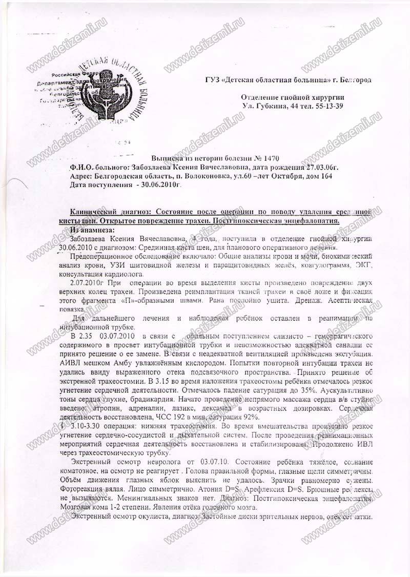 Моя дочь, Забозлаева Ксения, родилась совершенно здоровым ребенком. До четырех лет она росла жизнерадостной девочкой. В июле 2010 года врачи обнаружили у нее небольшую кисту на шее, которую, как они сказали, надо обязательно удалить. Нас заверили, что операция не сложная и ребенок будет в больнице не больше недели. Нас положили в Белгородскую областную больницу.