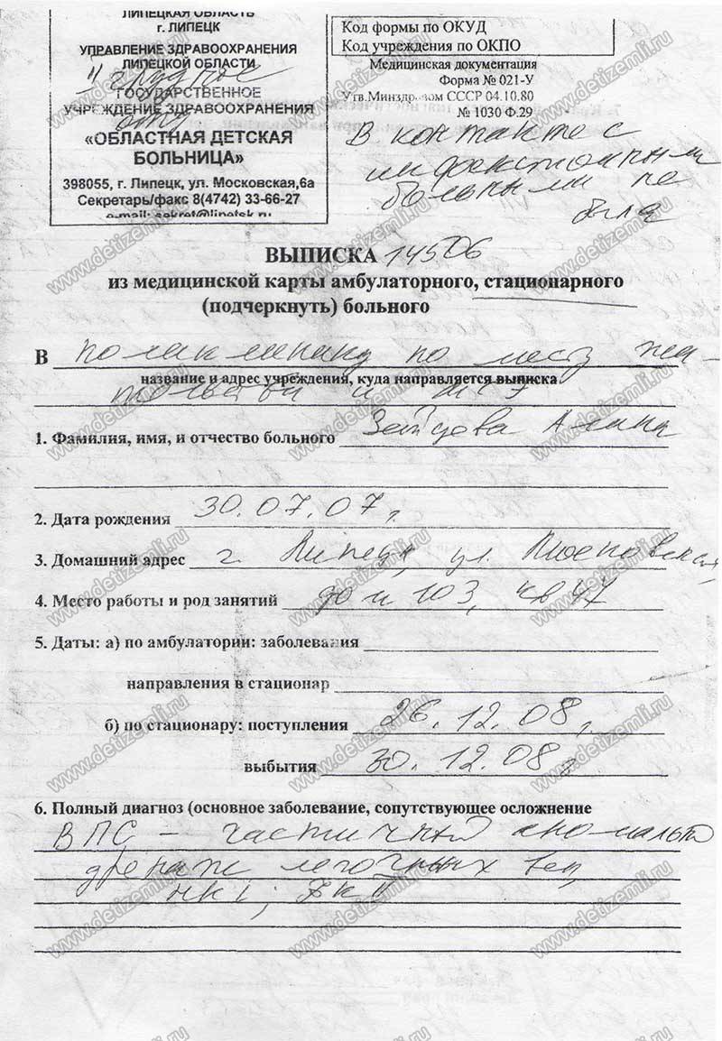 Алине всего лишь 1.5 года, а врачи-кардиологи установили диагноз: врожденный порок сердца. Управлением здравоохранения администрации Липецкой области выделена квота на проведение операции. Оперативное лечение назначено на март 2009 года в НЦССХ им. Бакулева г. Москва. Удачное проведение операции ( до 3 лет ) может дать ребенку шанс стать абсолютно здоровым.