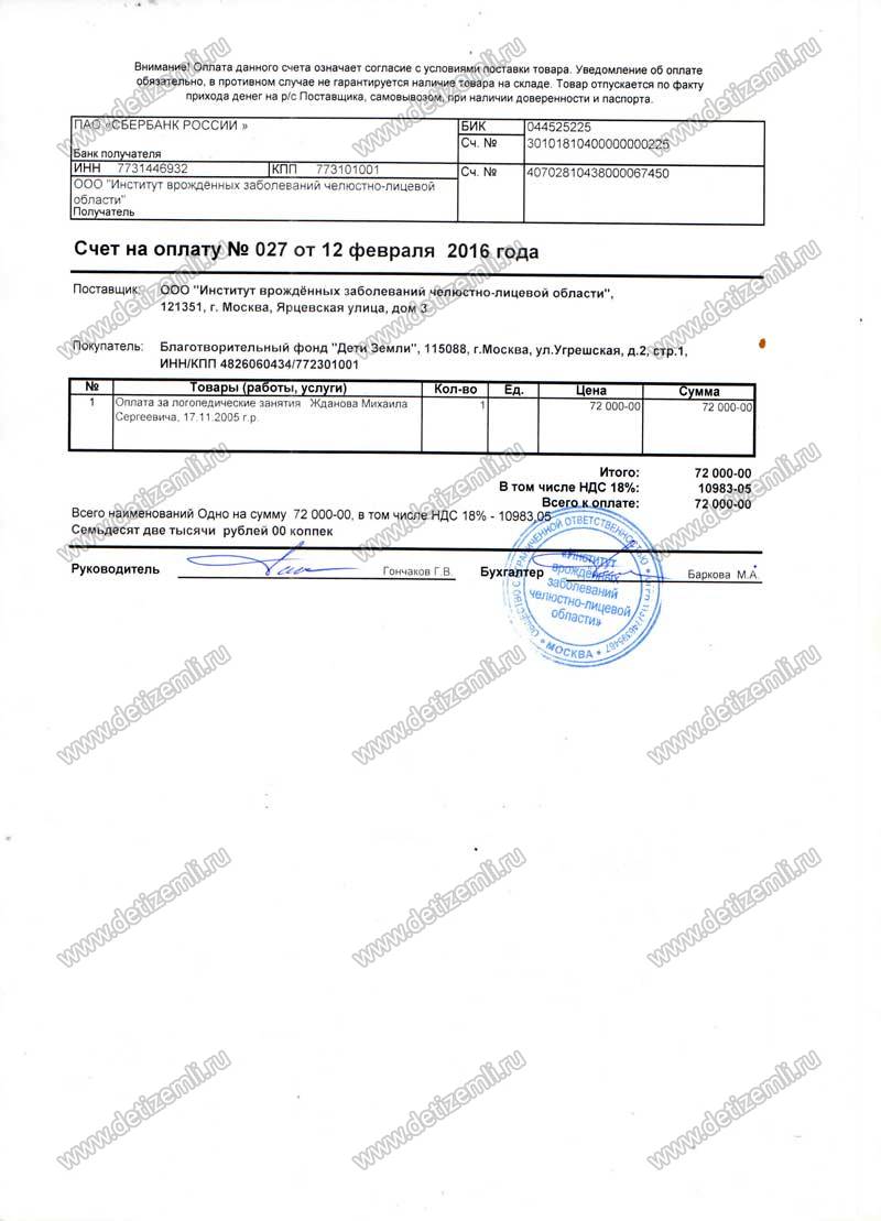 Оплачено лечения братьев Ждановых стоимостью 144000 руб.