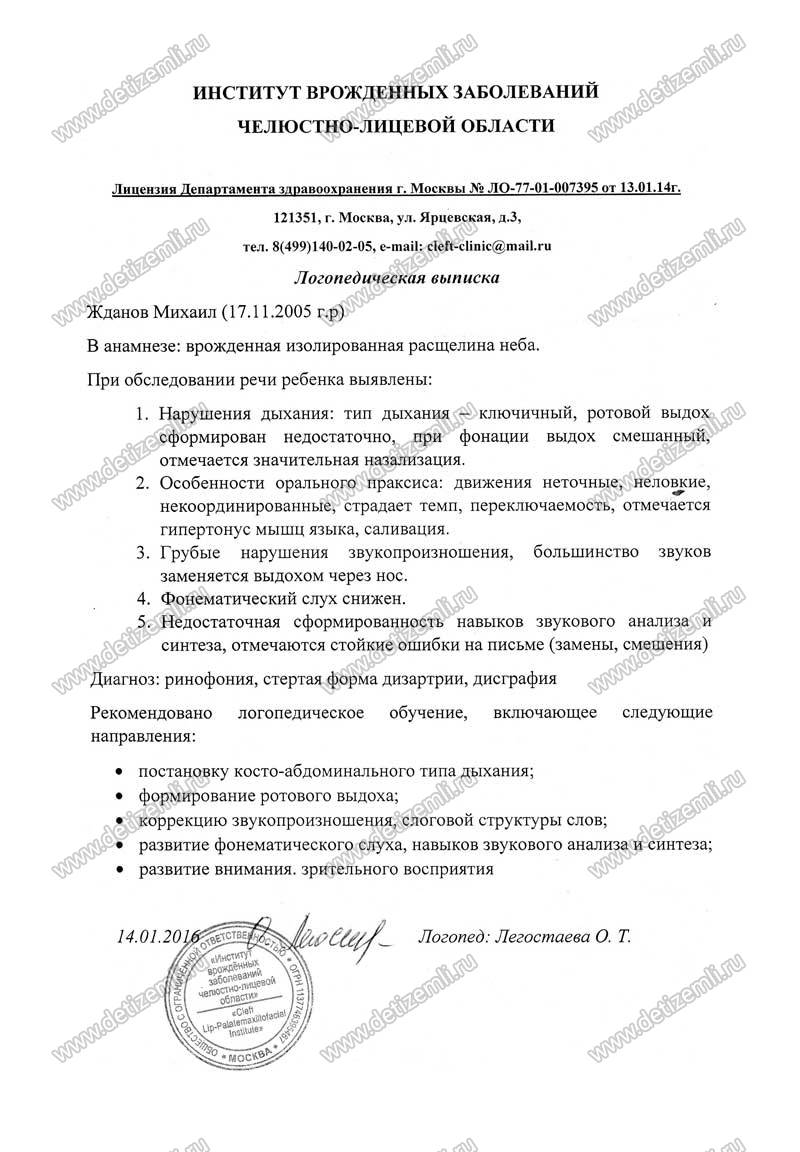Мише были сделаны 2 операции в Липецке, но видимо неудачно, потому что речь у ребёнка была гнусавая, невнятная. Несмотря на все усилия и занятия с логопедом, речь не улучшалась. И только в 2014 году мы попали на консультацию в Москву, и потом Мише там сделали операцию по устранению