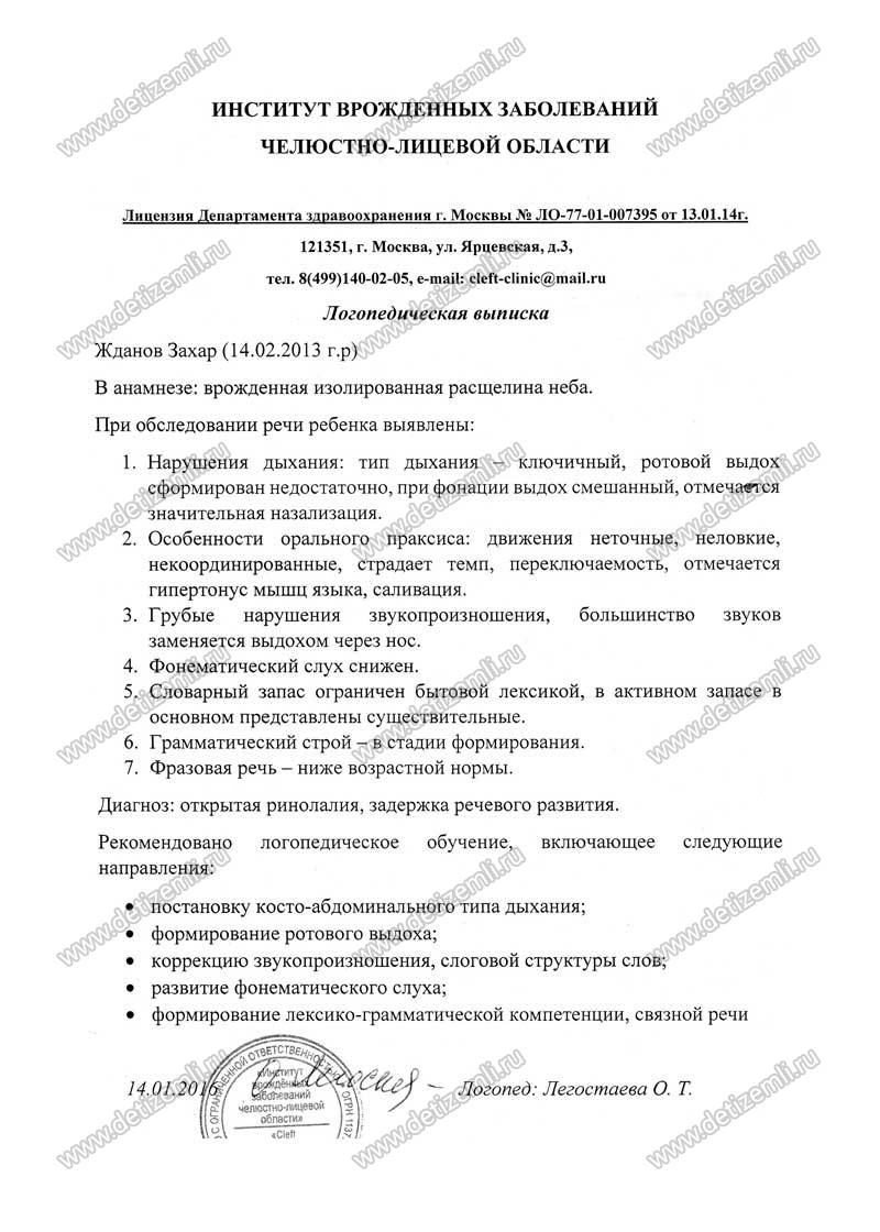 Ждановы Миша и Захар родные братья. У обоих мальчиков редкий диагноз: расщелина нёба. Мише в Липецке сделали две неудачные операции, и только после операции в Москве по устранению глотательной недостаточности у мальчика нормализовалась речь и появилась положительная динамика в лечении. У Захара такие же проблемы со здоровьем, как и у старшего брата, поэтому необходимо как можно раньше начать лечение. Сейчас братьям Ждановым срочно необходимо пройти лечение в Институте врожденных заболеваний