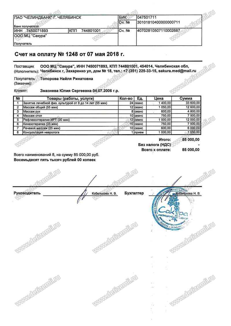 Оплачено лечение Юли стоимостью 85000 рублей.