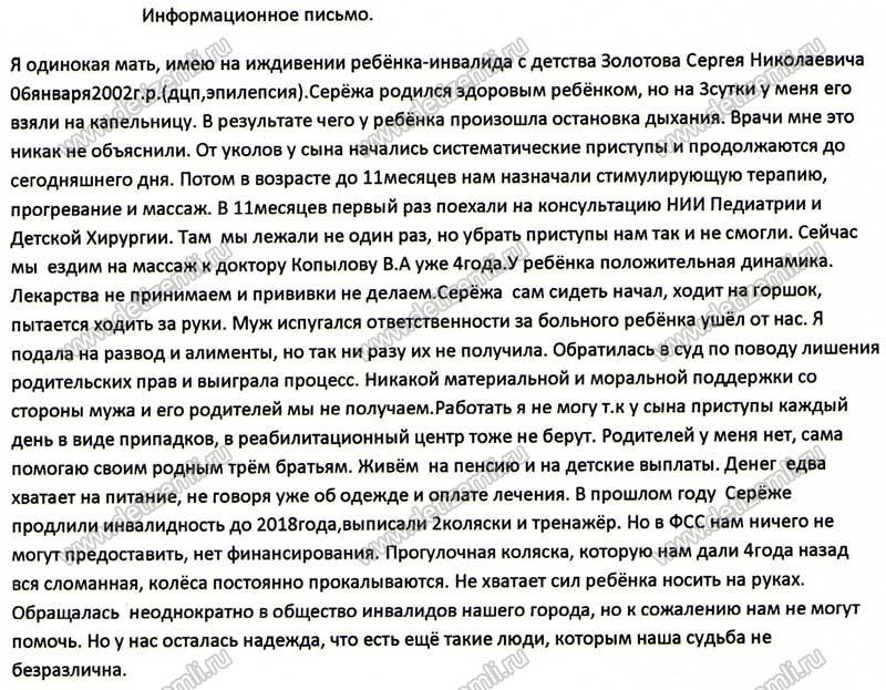 Благотворительный фонд помощи детям «Дети Земли» открывает сбор средств на приобретение инвалидной коляски для Золотова Сергея стоимостью 48 700 рублей. Сереже 9 лет и мама не в состоянии носить его на руках. Материальное состояние семьи очень тяжелое. Помогите ребенку-инвалиду!