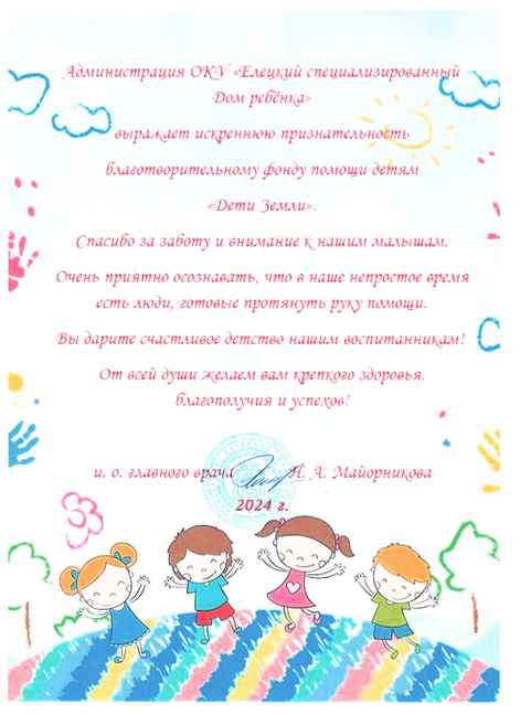 Благодарность от Елецкого дома ребенка